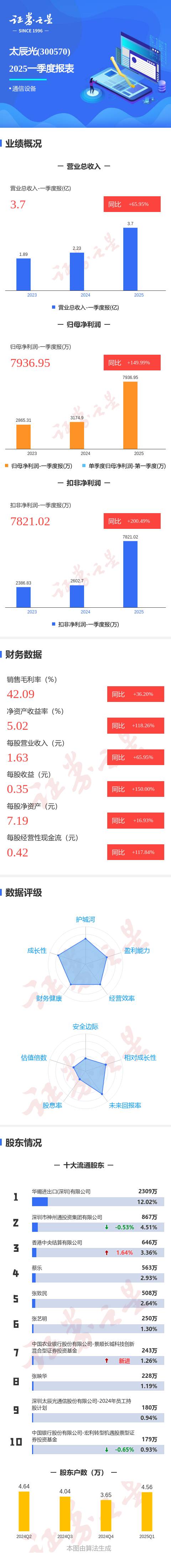 图解太辰光一季报: 第一季度单季净利润同比增149.99%