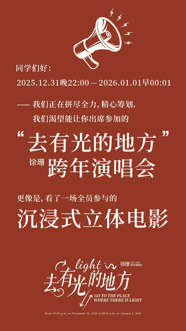 她曾用数百个日夜,在录音设备前编织旋律;如今,她将以首场个人舞台,为所有等待交出答卷。2025年12月31日,歌手徐珊的首场大型个人演唱会《去有光的地方》正式启幕,这不仅是一场跨年盛典,更是一次关于坚持、成长、温暖、治愈与共鸣的深情见证。